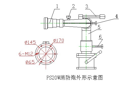 本產品主要結構外形如下圖所示,由炮頭(1)、壓力表(2)、消防炮手把(3)、上下鎖緊手輪(4)、炮體(5)、水平鎖緊手輪(6)等零部件組成。用戶可自行在連接座上安裝蝶閥(或球閥)來控制水流;松開水平上下鎖緊手輪,操縱手把(3)可實現炮的水平方向旋轉和炮口的上下旋轉,并由水平鎖緊手輪在任一位置鎖緊;水炮的開花直流炮頭,可實現炮口水柱射流和開花散射(水霧)。