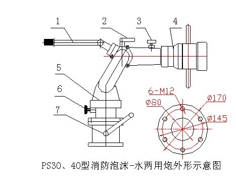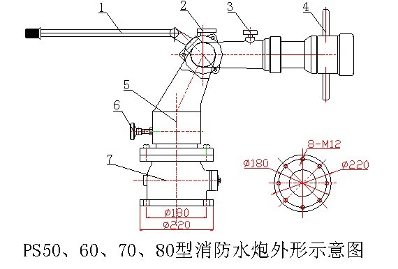 本產品主要結構外形如圖所示,由手柄(1)、上下鎖緊手柄(2)、壓力表(3)、炮頭(4)、炮體(5)、水平鎖緊手柄(6)、球閥(7)等零部件組成。松開水平鎖緊手柄(6),控制手柄(1)可實現水平方向旋轉,并由水平鎖緊手并在任一位置鎖緊;同時松開上下鎖緊(2)轉動手柄(1)可實現仰俯轉動-35°~+70°;水炮的開花直流炮頭,可實現炮口水柱射流和開花散射(水霧)。