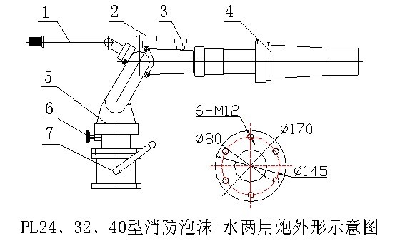 本產品主要結構外形如圖所示,由手柄(1)、鎖緊手柄(2)、壓力表(3)、炮頭(4)、炮體(5)、水平鎖緊手柄(6)、球閥(7)等零部件組成。松開水平鎖緊手柄(6),控制手柄(1)可實現水平方向旋轉,并由水平鎖緊手并在任一位置鎖緊;同時松開上下鎖緊(2)轉動手柄(1)可實現仰俯轉動-35°~+70°;水炮的開花直流炮頭,可實現炮口水柱射流和開花散射(水霧)。