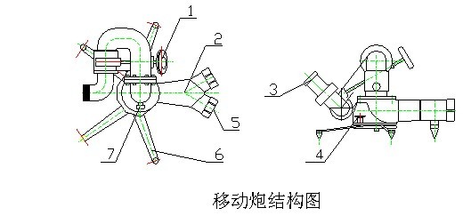 移動式消防炮主要結構見下圖,主要由俯仰控制機構總成(1)、炮座總成(2)、炮頭總成(噴霧噴水兩用、噴水噴炮沫兩用炮頭)(3)、支架鎖緊裝置(4)、進水接扣2-65(5)、支架總成(6)、水平鎖緊(7)等零部件組成。水平回轉控制機構和俯仰控制機構自鎖能力好,可實現任一位置鎖定。