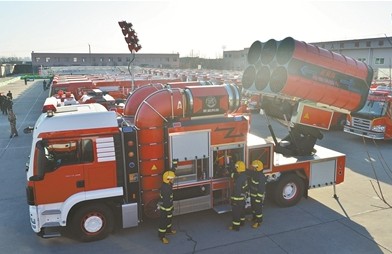 據了解,這批新設備有幾輛能夠攻克高層建筑、地下建筑等復雜環境火災的“鐵軍利器”。比如超高層供水消防車,能釋放大流量高壓水炮,垂直供水可達到300米以上,還有大功率遠程移動供水系統,能使用大口徑消防水帶將6公里以內的水源,以超大流量引到火災現場。排煙消防車適用于高層建筑、地鐵、隧道等搶險救援,應用于大型火災排煙、降溫、有毒氣體稀釋、化學物質洗消等,具有強勁風流和超強細水霧噴射,能有效避免災害現場二次污染,是目前世界上功能最全、排煙量最大的排煙消防車。多功能搶險破拆消防車則是集破拆、滅火功能于一身,當高層建筑發生火災,逃生通道受阻時,可通過沖擊錘、液壓鉗等快速打通逃生通道,當商場發生火災,廣告牌阻礙滅火時,可通過液壓鉗、液壓剪將廣告牌撕、剪成通道等多功能特種消防車。