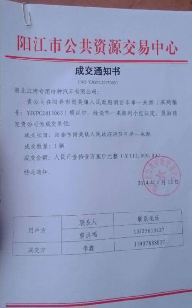 熱烈慶祝湖北江南專用特種汽車有限公司參加的陽春市崗美鎮人民政府消防車的采購項目已經成功中標,該項目經過2次廢標后,第三次就直接進行了單一來源采購,采購公告及中標公告已經公布到廣東省政府采購網及各個大型招投標網,消防車中標網址:http://www.gdgpo.gov.cn/gdgpmsPortal/jsp/article_content.jsp?articleId=297e55e844fe93b50145697d23b52991