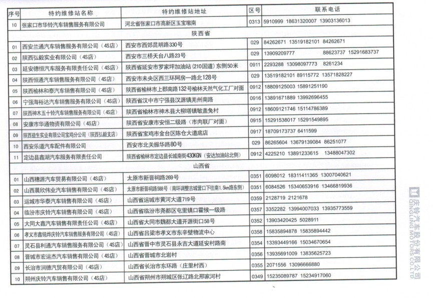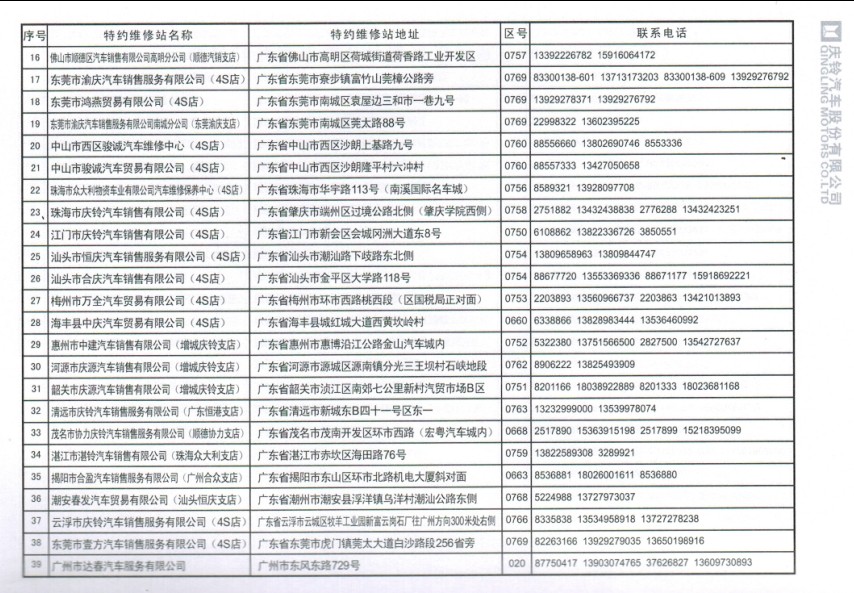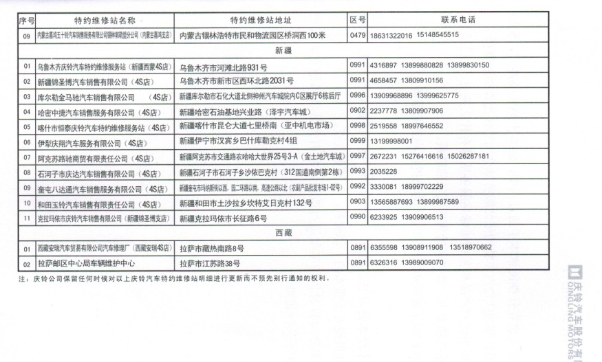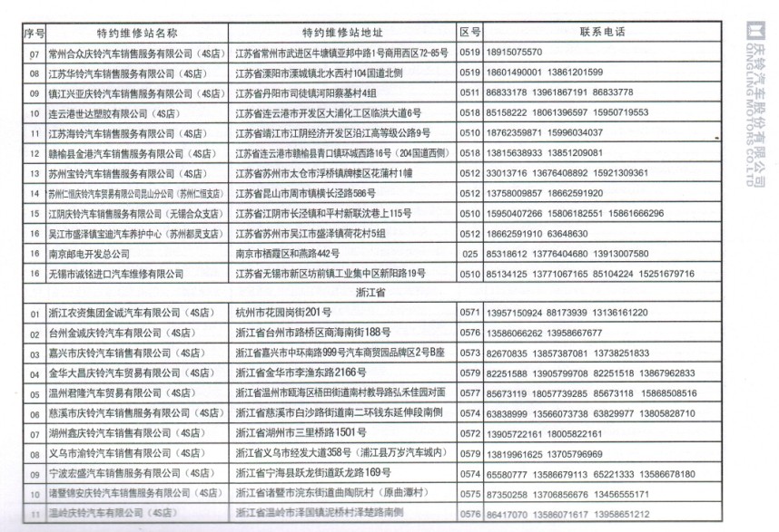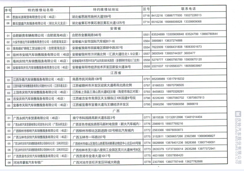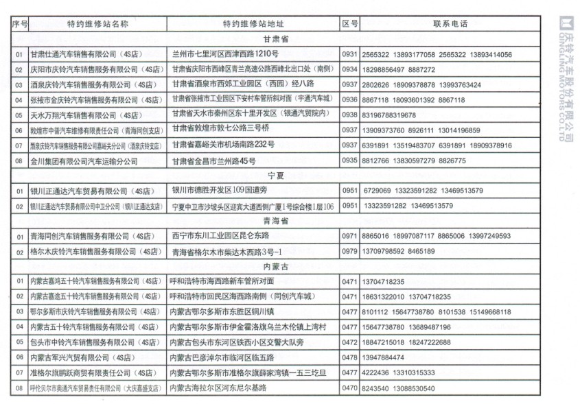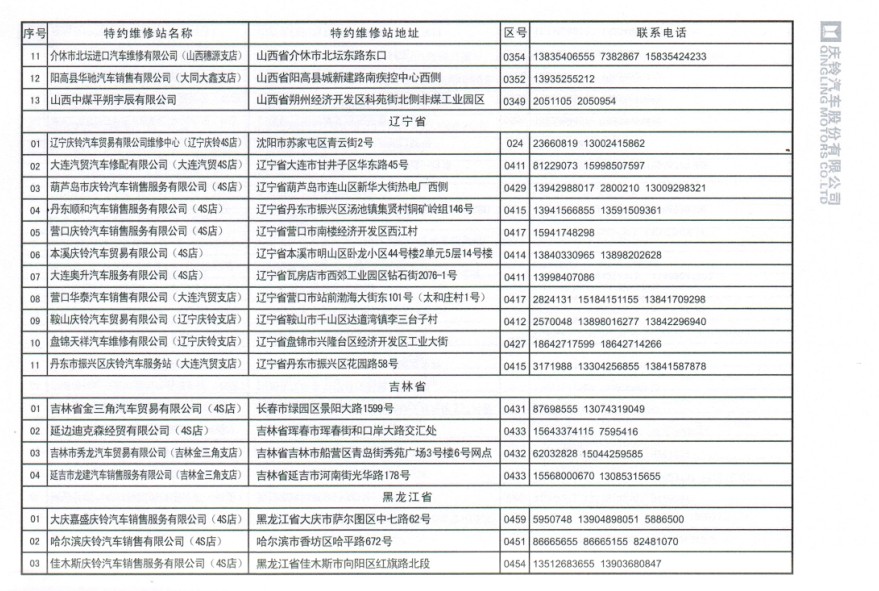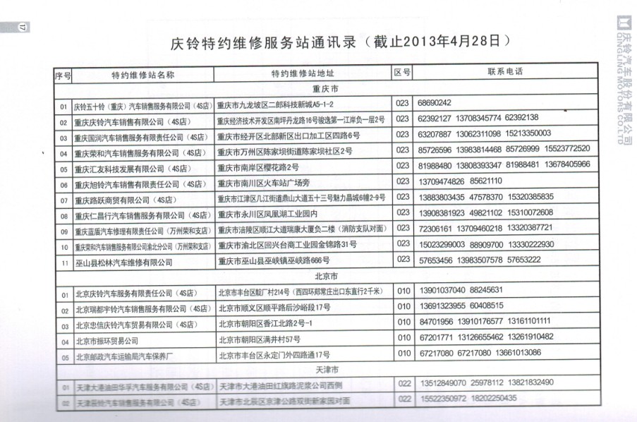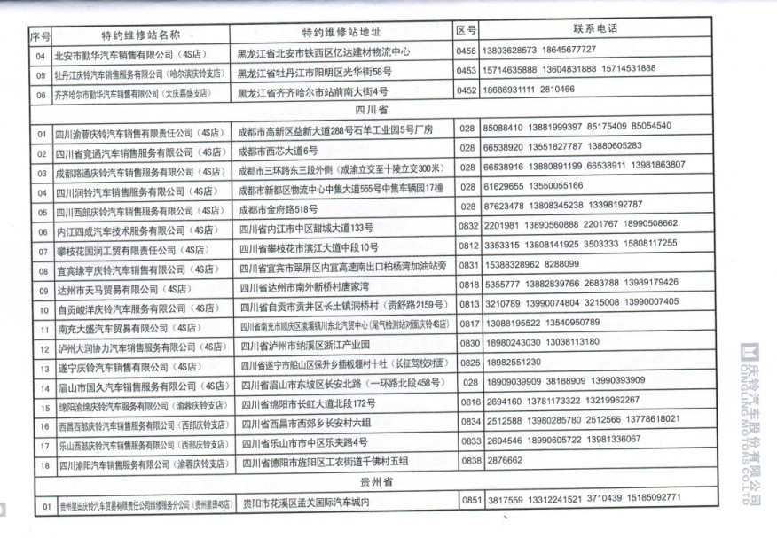 全國五十鈴(慶鈴)售后服務站通訊錄: