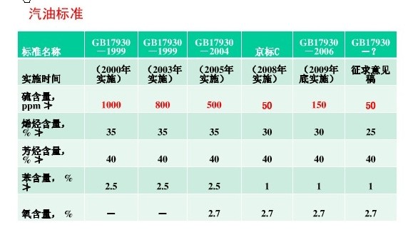2、硫含量(質量)降低了0.01%(100ppm)。 【國Ⅲ汽油】要求硫含量不高于0.015%(150ppm);【國Ⅳ汽油】要求硫含量不高于0.005%(50ppm)。 硫含量下降,對汽車尾氣排放性能得到改善,尤其是SO2排放量下降。但同時會增加煉油廠生產成本,脫硫成本。
