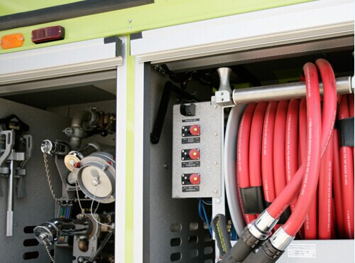 為了直達(dá)起火點(diǎn), Striker車體兩側(cè)還設(shè)置有兩個crosslays--手持消防水龍接管,急救員能迅速的從水箱拉出它們直接對準(zhǔn)火源。軟管可以迅速展開300英尺。 紅外攝像機(jī) INFRARED CAMERAS 熱成像攝像機(jī)安裝在車頂,向艙內(nèi)的顯示器發(fā)送即時畫面。急救員從屏幕上確定肉眼無法看到的熱源中心,全力撲滅燃燒最猛烈的部分。它還可以在惡劣天氣中導(dǎo)航(例如濃霧)。 底盤噴嘴 UNDERTRUCK NOZZLE 如果燃燒的燃油泄漏到跑道,ARFF急救員可能會發(fā)現(xiàn)自己行駛在火海上。如果出現(xiàn)這種情況,急救員可以啟動Striker位于底盤的6個360度旋轉(zhuǎn)噴嘴。 功率分配器 POWER DIVIDER Striker的700馬力V8發(fā)動機(jī),能同時推動汽車和炮塔泵。一個計(jì)算機(jī)控制的“分配器”在車軸和炮塔泵之間分配功率,使高速行駛中噴射成為可能。