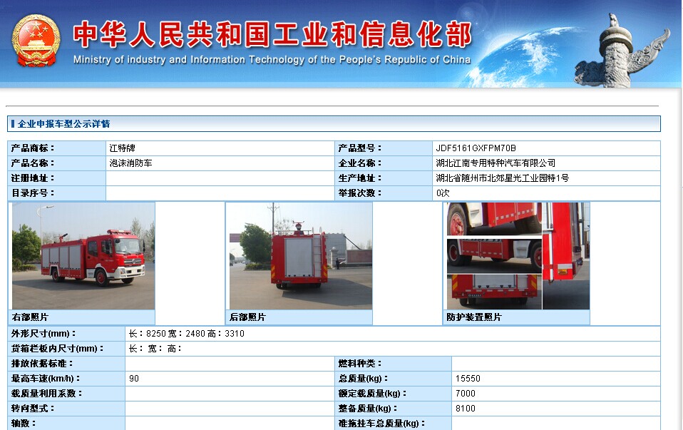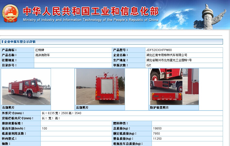 我公司國四排放標準的東風天錦消防車(6T)和斯太爾豪沃單橋水罐消防車(8T)經(jīng)國家消防裝備監(jiān)督檢驗中心(上海)檢測合格證后,在中華人民共和國工業(yè)和信息化部264批次進行公示,敬請期待264批次公告。