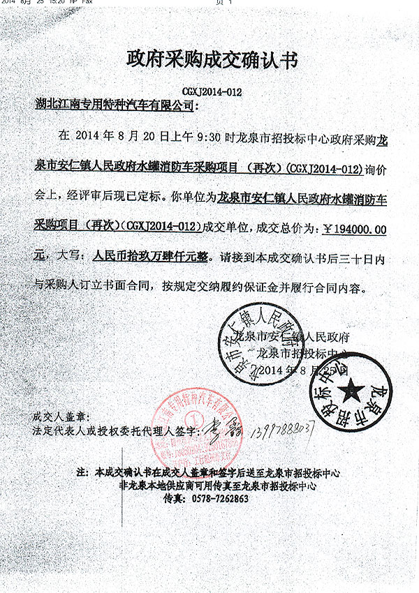由我公司銷售經理李鑫參加浙江麗水龍泉市安仁鎮東風多利卡水罐消防車,招標編號為:CGXJ2014-012經龍泉市公共資源交易中心采購,我公司獲得中標,經2天公示于今日正式下發中標通知書。