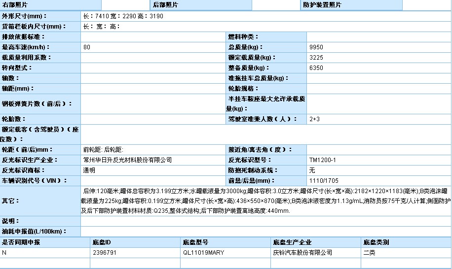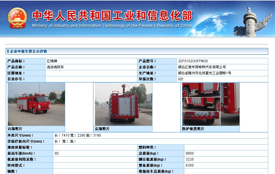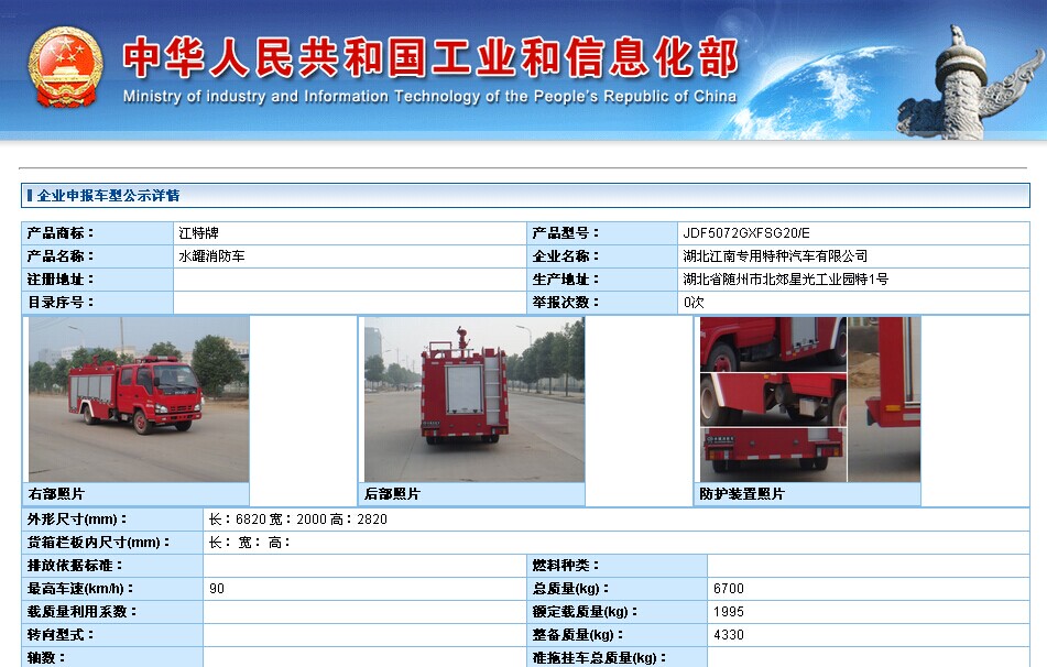 接到公告工信部最新消息266批次公告已經(jīng)開始公示,湖北江南專用特種汽車有限公司又公示了2款五十鈴消防車,一款是五十鈴底盤QL1070A1KWY改裝而成的,底盤軸距是3815的,該車載水量是3.5噸。另外一款是五十鈴底盤QL11019MARY改裝而成的,底盤軸距是4475的,,該車載水量4-5噸。下面請(qǐng)看我廠266批次公告公示的消防車截圖