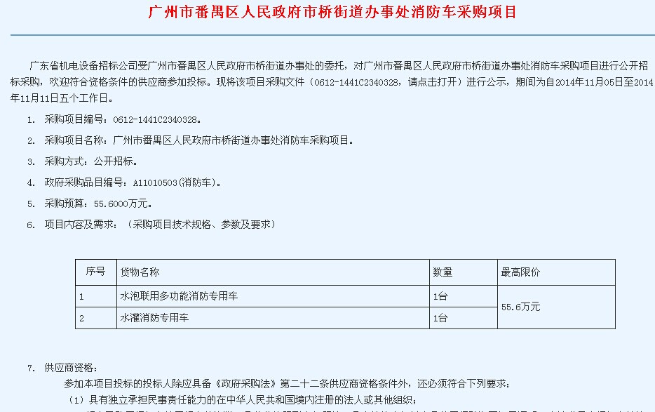 泡沫消防車和水罐消防車招標公告截圖及鏈接網址:http://www.gzg2b.gov.cn/Sites/_Layouts/ApplicationPages/News/NewsDetail___id$1$b51aea6a-0e38-472a-8815-ea68cd6392e4.html