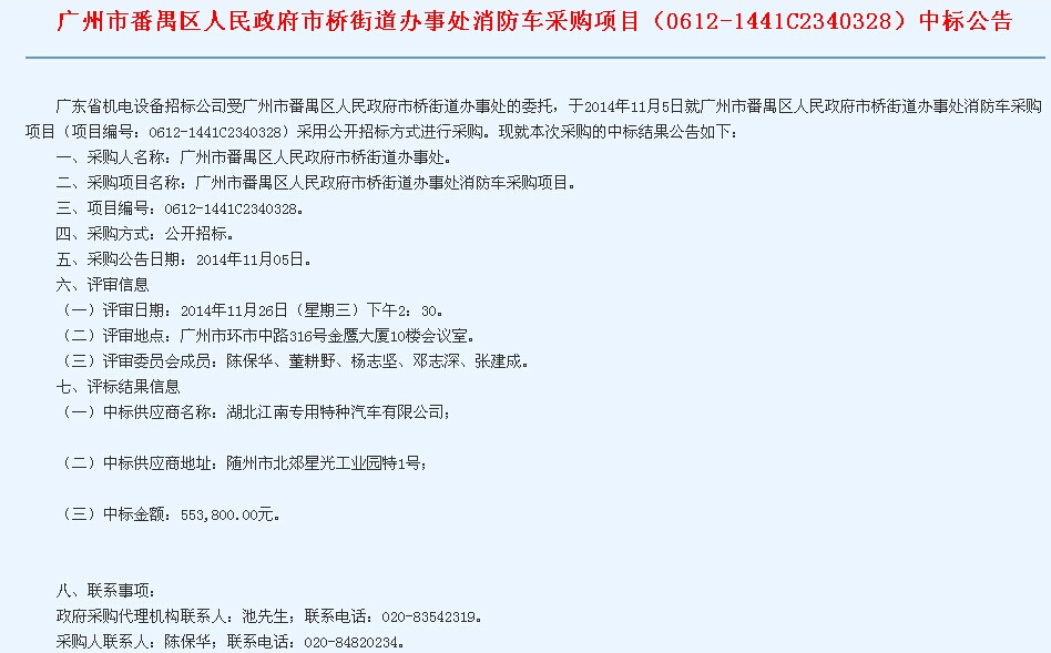 熱烈慶祝湖北江南專用特種汽車有限公司中標2臺五十鈴消防車,項目名稱:廣州市番禺區人民政府市橋街道辦事處消防車采購項目,項目編號0612-1441C2340328,該2臺消防車為水泡聯用多功能消防專用車和一臺水罐消防車,都為五十鈴底盤改裝而成,2款車型為我廠國四五十鈴消防車公告,型號為:JDF5072GXFSG20C型水罐消防車和JDF5072GXFSG20C型泡沫消防車,下面就公布一下招標公告截圖和中標公告截圖及鏈接網址