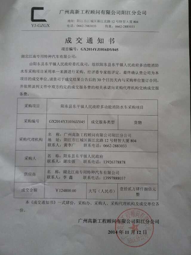多功能消防水車中標通知書: