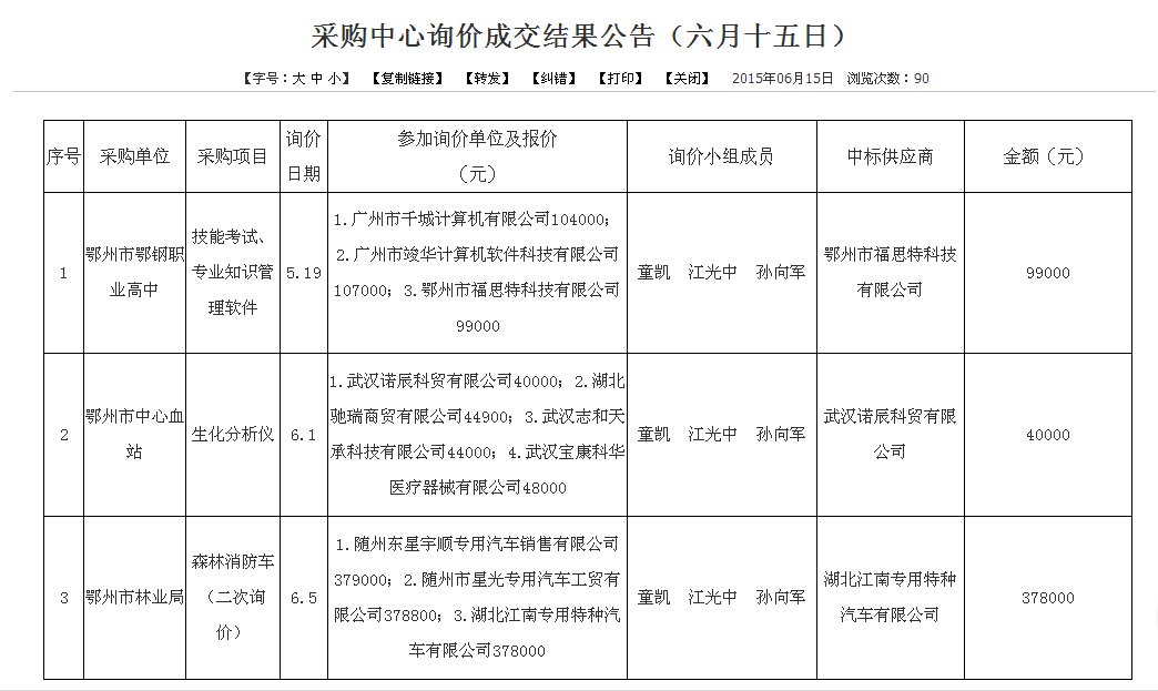 熱烈慶祝湖北江南專用特種汽車有限公司再次中標鄂州市林業局采購森林消防車的標,鄂州市林業局已經是第二次采購我廠消防車了,第一次是采購我廠的2臺東風福瑞卡水罐消防車,這次是采購東風森林消防車3臺,以下是本次中標的網址及截圖http://www.ezcgzx.gov.cn/info/2015/C06151891.htm