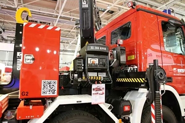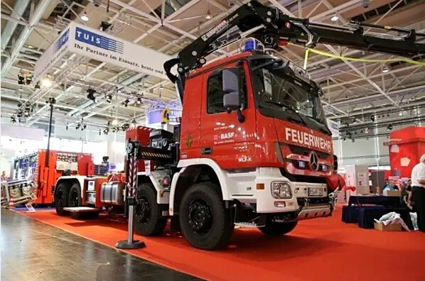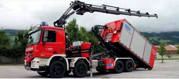 多功能消防車由安普公司為德國北威州明斯特地區的BASF Coatings GmbH工廠消防隊生產的拉臂鉤式多功能消防車,使用以MB Actros 3241四軸底盤,其隨車吊為HIAB XS 288-E6 “Hipro” 27.6mt,可遙控并附帶水和泡沫噴灑功能(射速每分鐘1325升)滾裝箱裝有一臺60kVA發電機以及多種救援設備和工具!