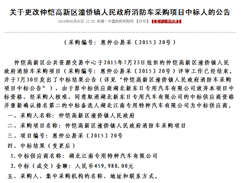 仲愷高新區(qū)潼僑鎮(zhèn)人民政府消防車采購(gòu)項(xiàng)目更改中標(biāo)截圖:
