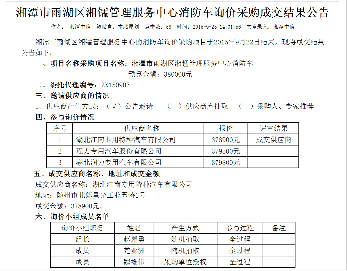 熱烈慶祝湖北江南專用特種汽車有限公司中標湘潭市雨湖區湘錳管理服務中心消防車詢價采購,湖北江南專用特種汽車有限公司憑著江南公司的實力中標的哦,湖北江南專用特種汽車有限公司是專業生產消防車水罐消防車泡沫消防車干粉消防車水泡干粉聯用消防車東風消防車五十鈴消防車豪沃消防車斯太爾消防車重汽消防車福田消防車等等專用消防車,湖北江南專用特種汽車有限公司是隨州唯一一家有消防車生產資質的廠家,下面公布一下湖北江南專用特種汽車有限公司中標公告: