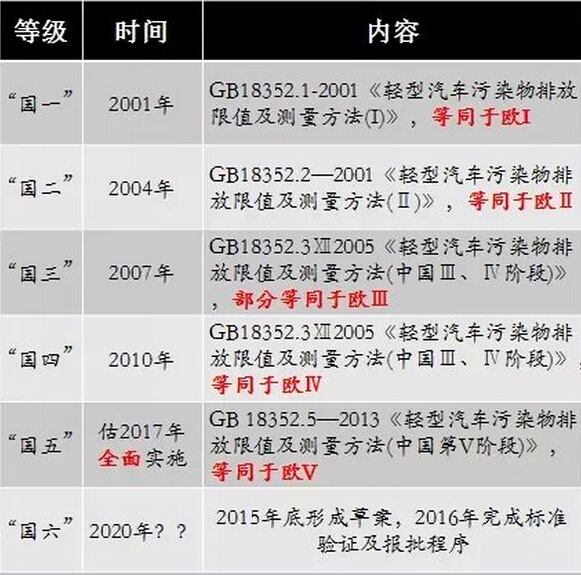 如上表所示,歐洲排放標準由歐盟參與國自愿認可并在其國內強制實施,自1992年至今,22年間更新了5個版本,差不多4年左右更新一次。同時,歐洲排放標準將汽車分為總質量不超過3500公斤(輕型車)和總質量超過3500公斤(重型車)兩類。輕型車不管是汽油機或柴油機車,整車均在底盤測功機上進行試驗;重型機則用所裝發動機在發動機臺架上進行試驗,并以廢氣內的CO(一氧化碳)、HC+NOX(碳氫化合物和氮氧化物)及PM(微粒,碳煙)等有害氣體為檢測依據(因為這些都能在人體中引起慢性中毒)。