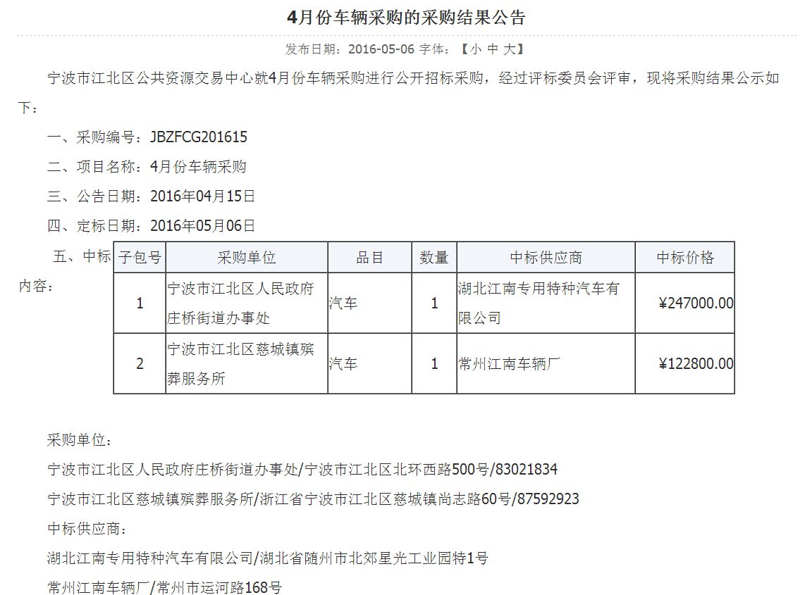 熱烈慶祝湖北江南專用特種汽車有限公司中標寧波市江北區公共資源交易中心就4月份車輛采購進行公開招標采購項目,采購編號:JBZFCG201615,項目名稱:4月份車輛采購,我廠所投的產品是包一項目,五十鈴的水罐消防車,經過幾家的公平競爭,最終由我廠最高分中標,這就是江南消防車廠家的實力,下面請看中標公示及鏈接網址:http://www.jbggjy.cn/View.aspx?ContentId=9864&CategoryId=76