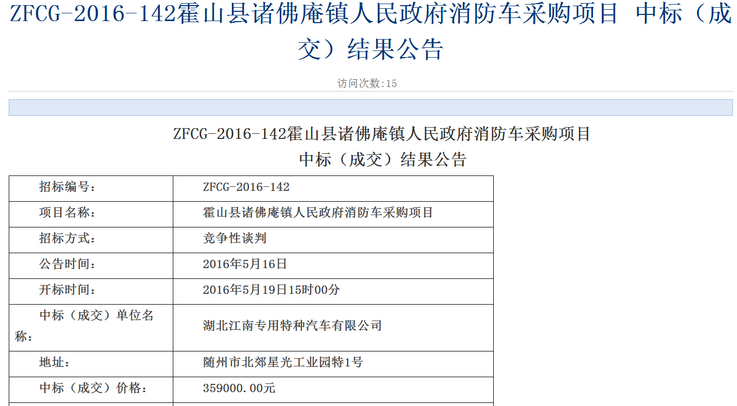 最新喜訊,我公司再次中標(biāo)東風(fēng)153水罐消防車,本次由霍山縣諸佛庵鎮(zhèn)人民政府消防車采購,投標(biāo)現(xiàn)場一共有4家供應(yīng)商前去應(yīng)標(biāo),經(jīng)過2番報(bào)價(jià),最終我廠以最低價(jià)中標(biāo),本次中標(biāo)結(jié)果已經(jīng)在各大政府采購網(wǎng)公布,可以查詢結(jié)果,公布結(jié)果鏈接網(wǎng)址:http://www.ahzfcg.gov.cn/news/2016-05/b131ca4a-bf8b-43b2-a2da-778ca6b81715.html