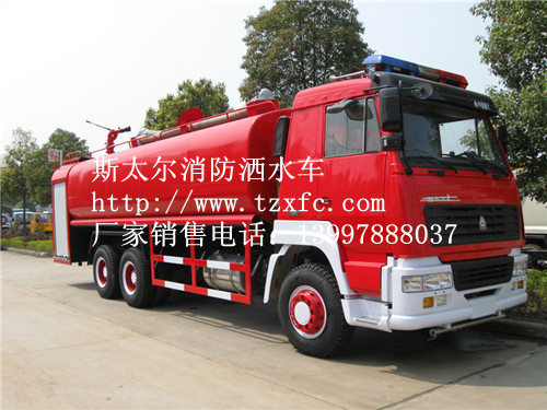 湖北江南汽車(chē)公司生產(chǎn)的消防灑水車(chē)安裝消防車(chē)專(zhuān)用消防泵、消防炮、消防取力器。罐體后帶工作平臺(tái),平臺(tái)上安裝綠化灑水炮,灑水炮可全方位旋轉(zhuǎn),帶前沖后灑,帶側(cè)噴,可連續(xù)調(diào)成直流狀、霧狀、大雨、小雨、毛毛雨,帶安全護(hù)欄。罐體頂部安裝消防水炮。帶消防接口,可通過(guò)消防栓進(jìn)水,帶自流閥,消防綠化卷盤(pán)。適用于園林綠化,消防灑水,消防滅火,礦山降塵,生活小區(qū)滅火,電廠(chǎng)消防,需要時(shí)還可用于噴灑農(nóng)藥。 消防灑水車(chē)可分為泡沫消防灑水車(chē)及水罐消防灑水車(chē)。 泡沫消防灑水車(chē)專(zhuān)用部分由液罐、水罐、泵室、器材箱、動(dòng)力輸出及傳動(dòng)系統(tǒng)、管路系統(tǒng)、電氣系統(tǒng)等組成。 泡沫消防灑水車(chē)主要裝備消防水泵、水罐及泡沫液罐、泡沫混合系統(tǒng)、泡沫槍、炮及其他消防器材,可以獨(dú)立撲救火災(zāi)。特別適用于撲救石油及其產(chǎn)品等油類(lèi)火災(zāi),也可以向火場(chǎng)供水和泡沫混合液,是石油化工企業(yè)、輸油碼頭、機(jī)場(chǎng)以及城市專(zhuān)業(yè)消防隊(duì)必備的消防灑水車(chē)輛 。 水罐消防灑水車(chē)除了裝備消防水泵及器材以外,還設(shè)有較大容量的貯水罐及水槍、水炮等?蓪⑺拖廊藛T輸送至火場(chǎng)獨(dú)立進(jìn)行撲救火災(zāi)。它也可以從水源吸水直接進(jìn)行撲救,或向其他消防車(chē)和滅火噴射裝置供水。在缺水地區(qū)也可作供水、輸水用車(chē),適合撲救一般性火災(zāi),是公安消防隊(duì)和企事業(yè)專(zhuān)職消防隊(duì)常備的消防車(chē)輛。