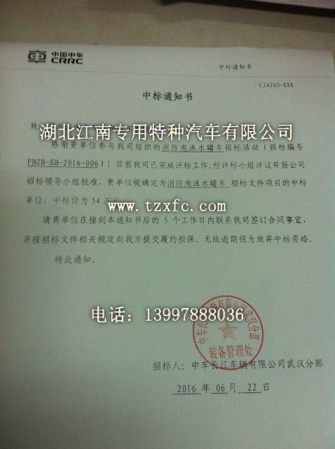 熱烈慶祝湖北江南專用特種汽車有限公司中標中車長江車輛有限公司武漢分部組織招投標采購的豪沃單橋泡沫消防車,我司銷售代表李鑫前往中車長江車輛有限公司武漢分部去投標,經過公正公平的評標標準,最終由我公司成功拿下,下面是由中車長江車輛有限公司武漢分部頒發的中標通知書(如圖)