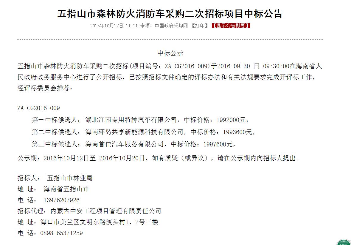熱烈慶祝五指山市森林防火消防車采購項目我公司中標,該項目中標金額199.2萬元整,本次五指山市林業局已經是第二次采購我公司的森林防火消防車了,下面是我公司中標公示鏈接:http://www.ccgp.gov.cn/cggg/dfgg/zbgg/201610/t20161012_7421334.htm