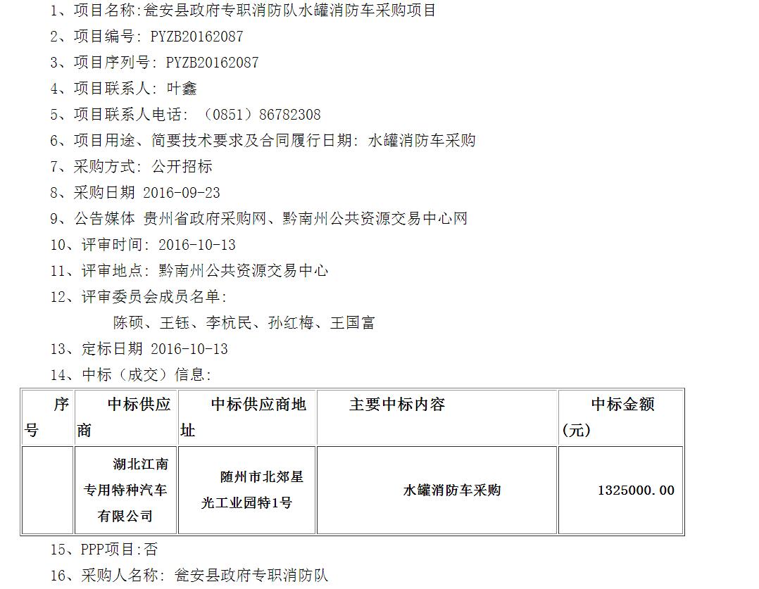熱烈慶祝我公司中標(biāo)5輛東風(fēng)銳鈴水罐消防車,該采購(gòu)人是甕安縣政府專職消防隊(duì),由貴州鵬業(yè)工程建設(shè)咨詢事務(wù)有限責(zé)任公司組織的本次的招投標(biāo)采購(gòu),經(jīng)過(guò)公正、公平的競(jìng)爭(zhēng),最終由我公司中標(biāo),5臺(tái)銳鈴水罐消防車中標(biāo)公告鏈接:http://www.ccgp.gov.cn/cggg/dfgg/zbgg/201610/t20161021_7462995.htm