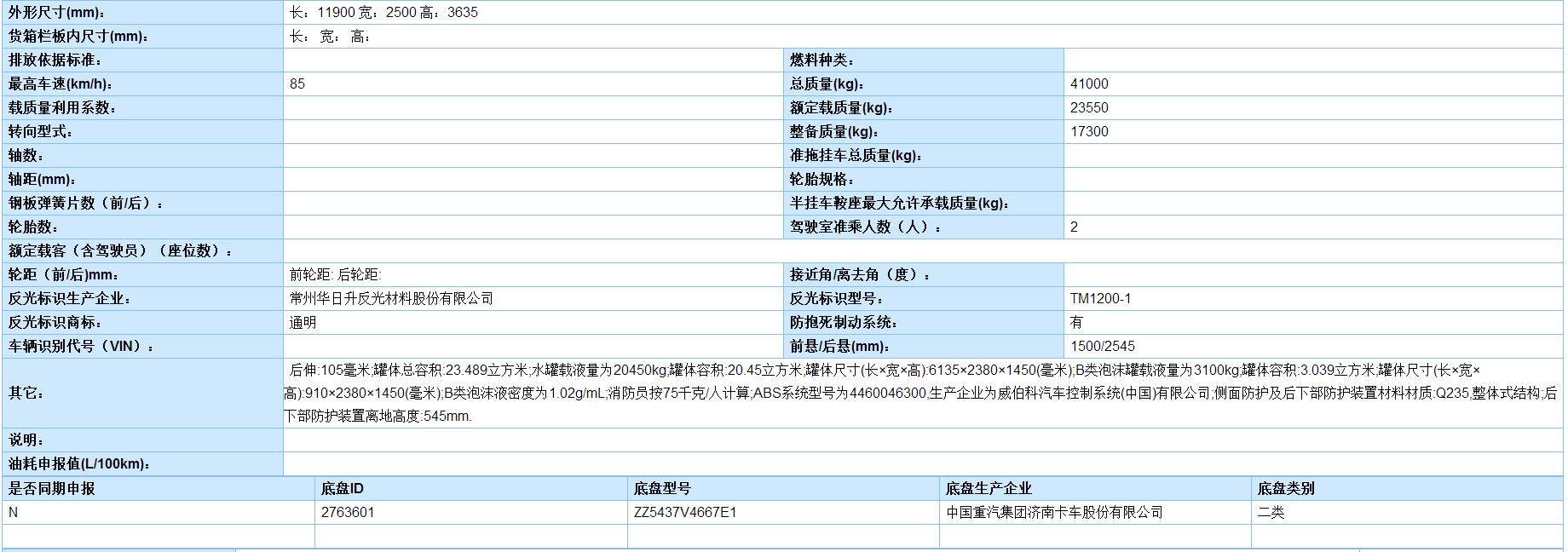 重汽豪沃前四后八泡沫消防車公示中,該車水20噸+泡沫5噸,采用重汽豪沃重型底盤改裝而成,其底盤型號為:ZZ5437V4667E1,整車型號為:JDF5410GXFPM240  型泡沫消防車該車的詳細技術參數請直接與我公司銷售部聯系,0722-3808778董經理