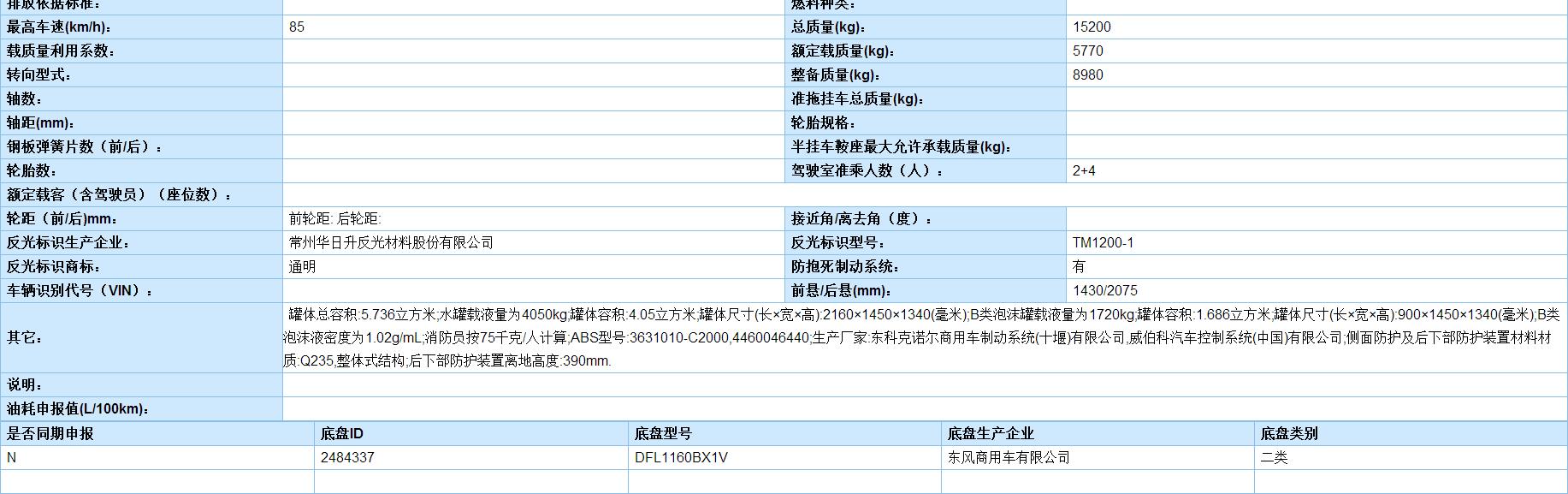 國五東風天錦泡沫消防車公示中,該車水容積4噸,泡沫容積2噸,底盤采用東風天錦原廠底盤,其底盤型號為DFL1160BX1V,整車型號為:JDF5154GXFPM60型泡沫消防車國五東風天錦泡沫消防車詳細技術參數請與我公司銷售部聯系,0722-3808778董經理