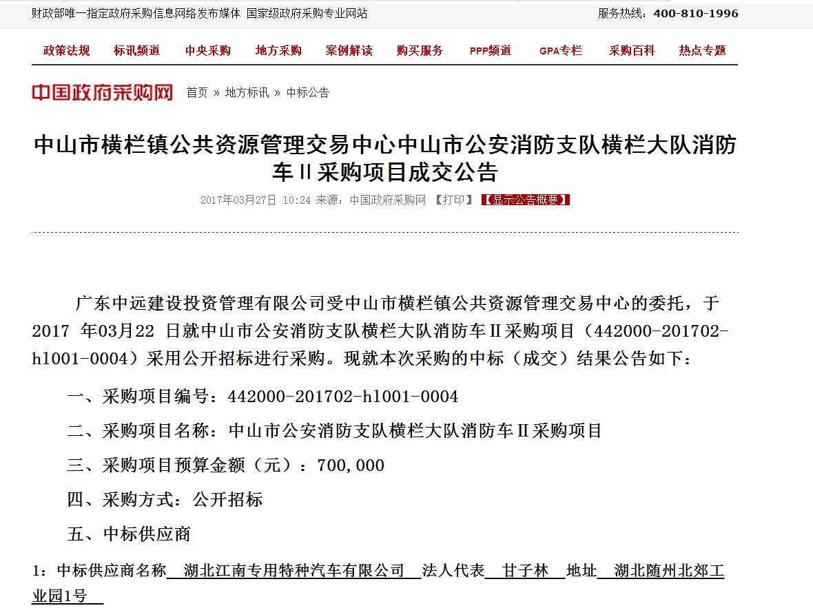 微型消防車中標公示鏈接http://www.gdgpo.gov.cn/showNotice/id/40288ba95b0b3c23015b0d6f393711ae.html