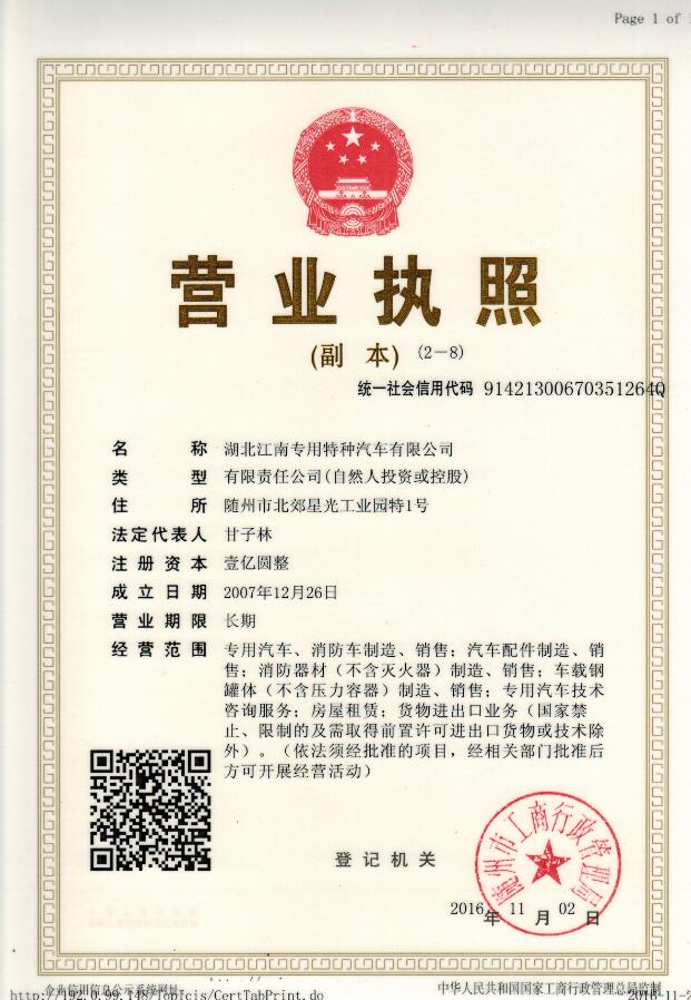 湖北江南專用特種汽車有限公司最新營業執照公布