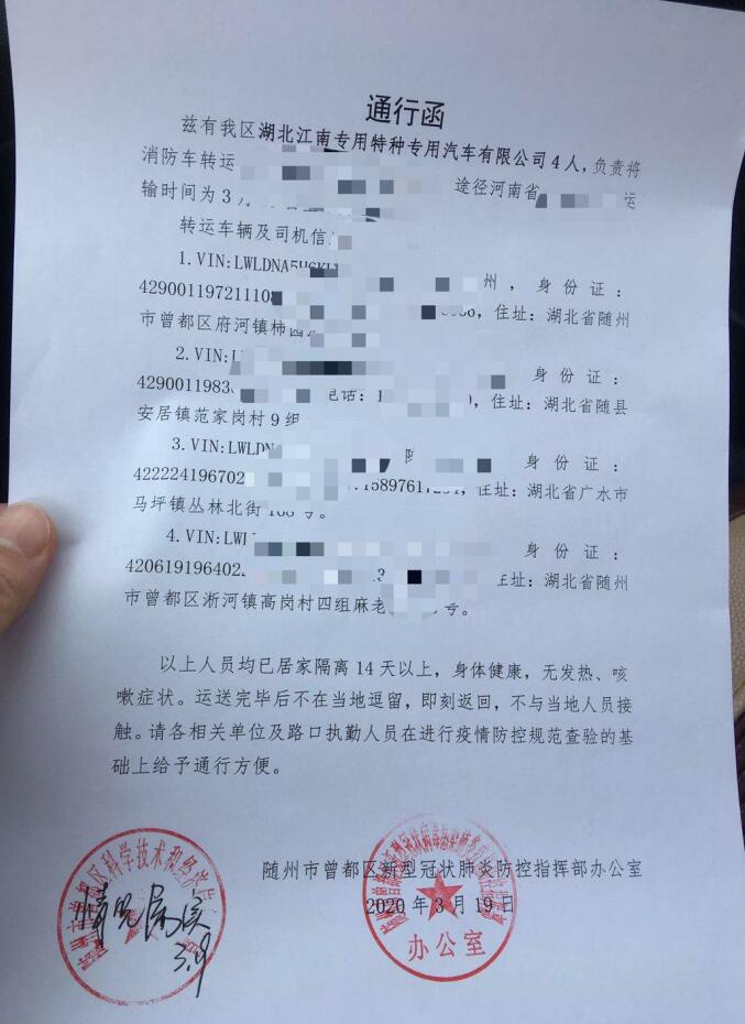湖北由于受疫情影響,預(yù)計年后發(fā)的車輛全部推遲了,我公司在3月16日正式復(fù)工,復(fù)工后第一時間安排送車,辦理一切通行手續(xù)后,4輛消防車今日發(fā)出,預(yù)計明天到達客戶所在地高速路口,由客戶在高速口接車,詳情咨詢:0722-3808778董經(jīng)理