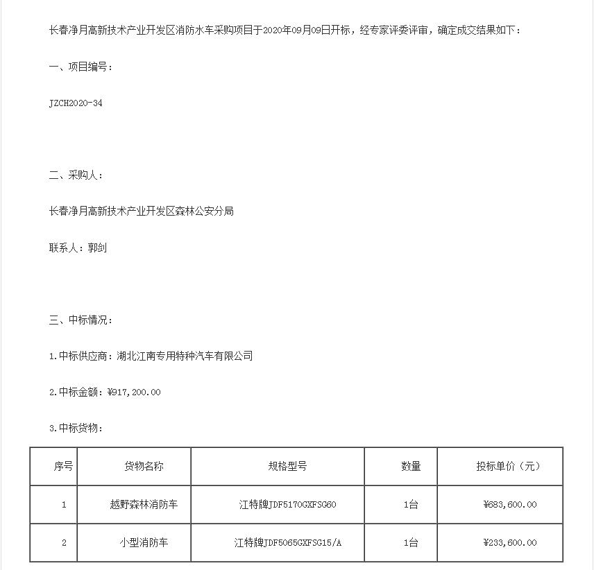 長(zhǎng)春凈月高新技術(shù)產(chǎn)業(yè)開發(fā)區(qū)森林公安分局委托長(zhǎng)春凈月高新技術(shù)產(chǎn)業(yè)開發(fā)區(qū)政府采購中心根據(jù)《中華人民共和國(guó)政府采購法》、《政府采購貨物和服務(wù)招標(biāo)投標(biāo)管理辦法》等有關(guān)法律法規(guī)的規(guī)定,對(duì)長(zhǎng)春凈月高新技術(shù)產(chǎn)業(yè)開發(fā)區(qū)消防水車采購項(xiàng)目進(jìn)行公開招標(biāo), 經(jīng)專家評(píng)委評(píng)審,確定湖北江南專用特種汽車有限公司中標(biāo)。廠家電話:13997888036董經(jīng)理 http://procure.jingyue.gov.cn/cms/information/showinformation.html?id=3703