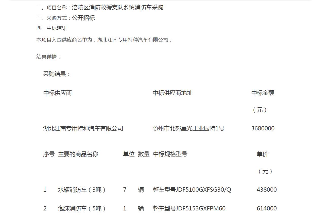 我公司中標的8臺五十鈴消防車順利交付涪陵區消防救援支隊,其中有7臺3噸水罐消防車是五十鈴700P底盤改裝,另外1臺5噸泡沫消防車是五十鈴FVR底盤改裝。以下是該項目的中標網站公示截圖及鏈接: